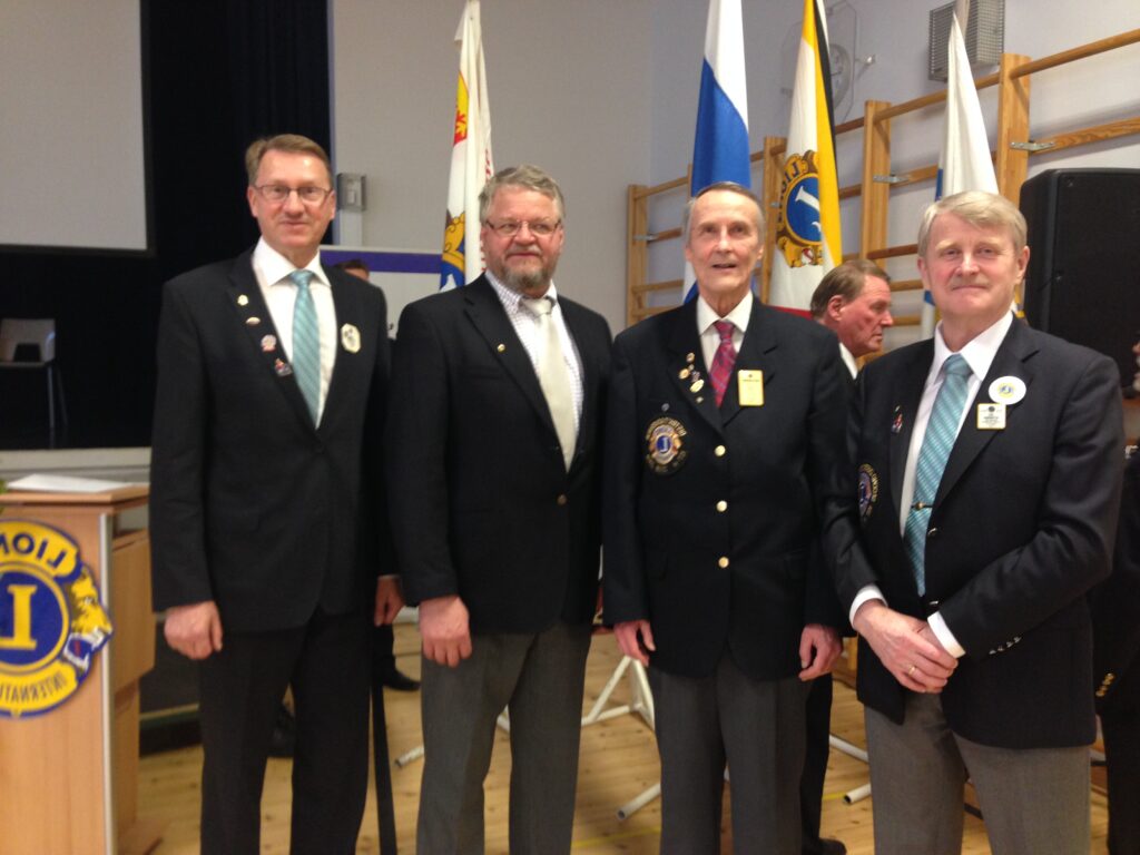 Vuosijuhla Outokummussa Kuvassa vasemmalta: Suomen Lions-liitto ry:n puheenjohtaja Tuomo Holopainen, Seppo Kettunen, Pentti Juntunen ja Leo Ryynänen.
